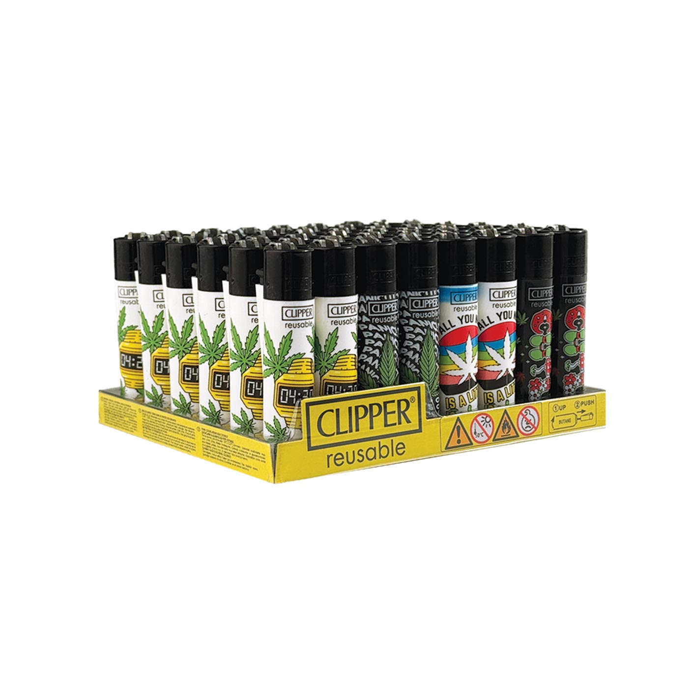 Een display met 48 Clipper aanstekers. De Clipper aanstekers zijn voorzien van het bekende uitneembare staafje met vuursteen en zijn navulbaar met butaangas. Dit maakt de aanstekers geschikt voor langdurig gebruik. Butaangas is afzonderlijk verkrijgbaar.